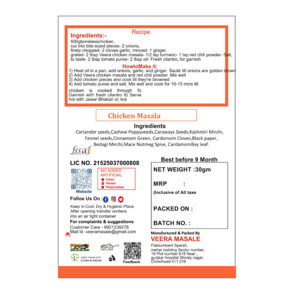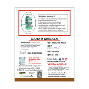 Veera Masala’s Chicken Masala is a flavorful, medium-hot blend made to bring out the best in your chicken curry, fry, or tandoori preparations. With a perfect mix of dry-roasted spices like black pepper, cloves, coriander, cinnamon, bay leaf, and chili, it gives your chicken dishes a rich color, bold aroma, and deep taste.