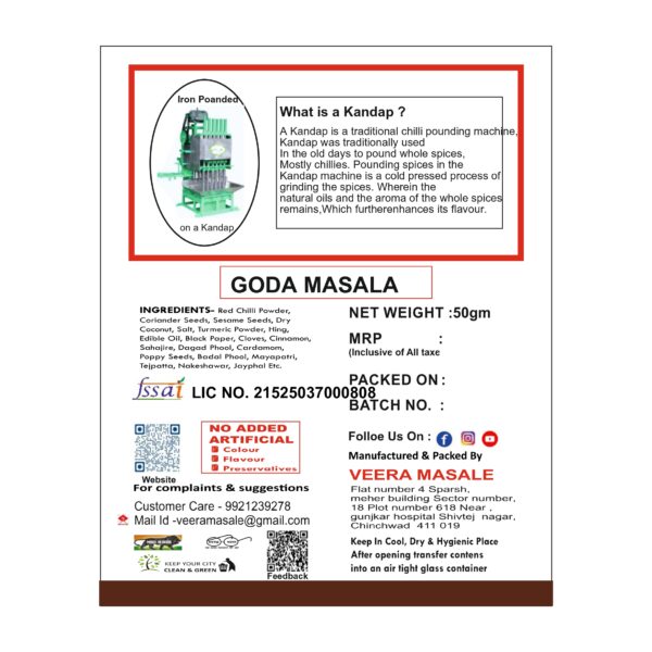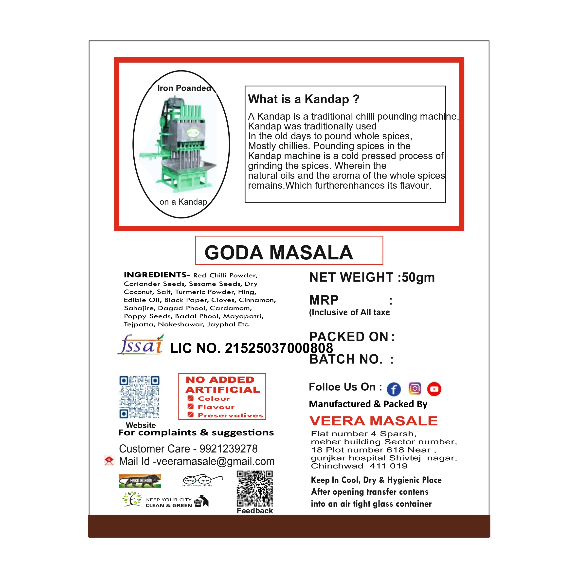 Veera Masala’s Goda Masala is a sweet-spicy Maharashtrian blend made with roasted coconut, sesame seeds, coriander, dagad phool (stone flower), cinnamon, cloves, and other aromatic spices. Known for its deep brown color and mellow warmth, Goda Masala adds richness and traditional flavor to classic Maharashtrian dishes.